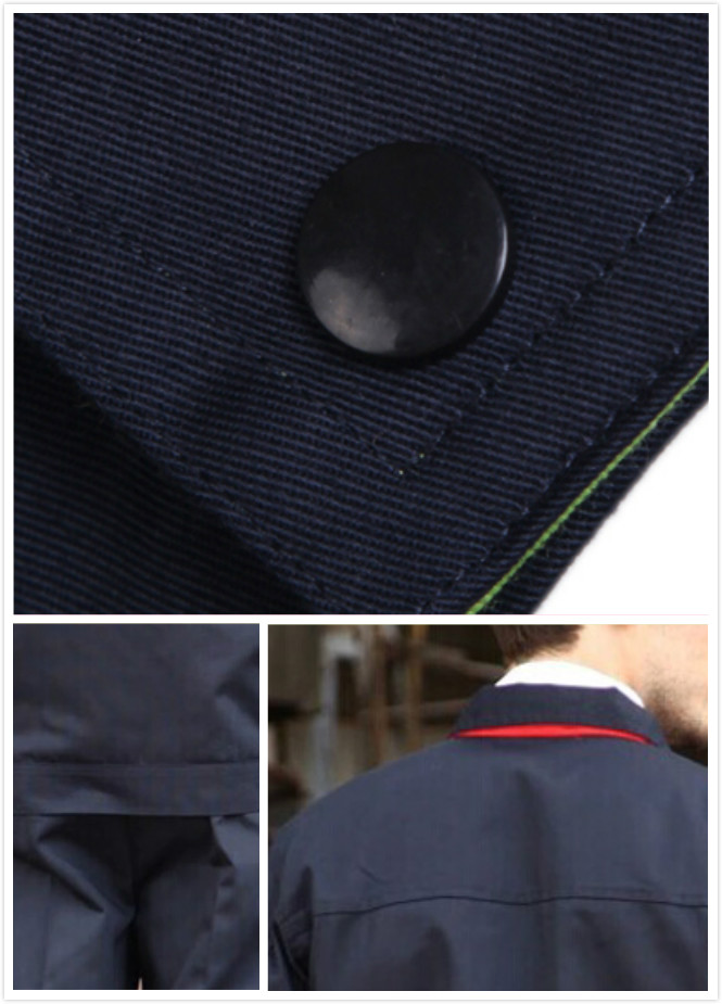 袖口、下擺:以往是采用松緊,現(xiàn)在是采用紐扣式的收縮。這樣更加靈活的符合人自由對這兩個部位的調整。