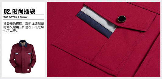 JL-QD203東莞廠服以棗紅色為主色,插袋采用拼接,夾克式袖口設(shè)計,左肩筆袋,精致時尚,工作中非常方便