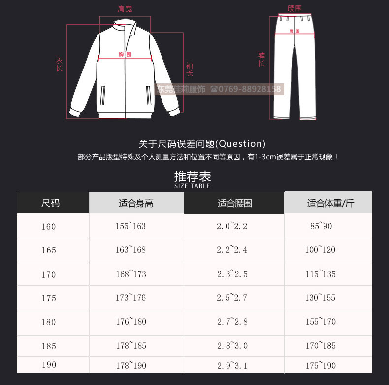 155(S) 165(M) 170(L) 175(XL) 180(XXL) 185(XXL)